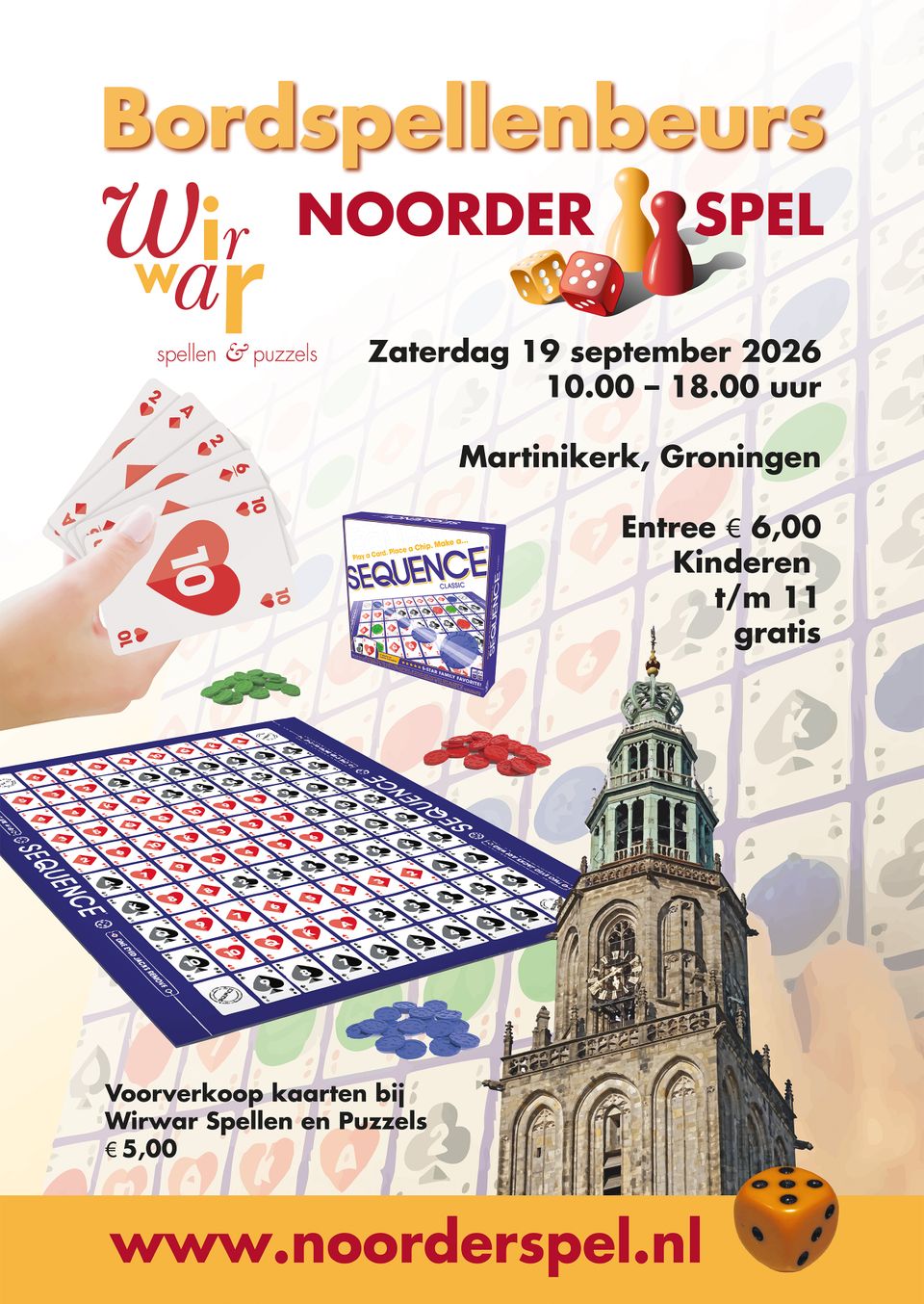Zaterdag 19 september van 10 tot 18 uur in de schitterende Martinikerk wordt bordspellenbeurs Noorderspel door Wirwar georganiseerd. Voor jong en oud zijn er honderden spellen om uit te proberen. Entree aan de deur €6,- . Kinderen tot en met 11 jaar gratis entree.