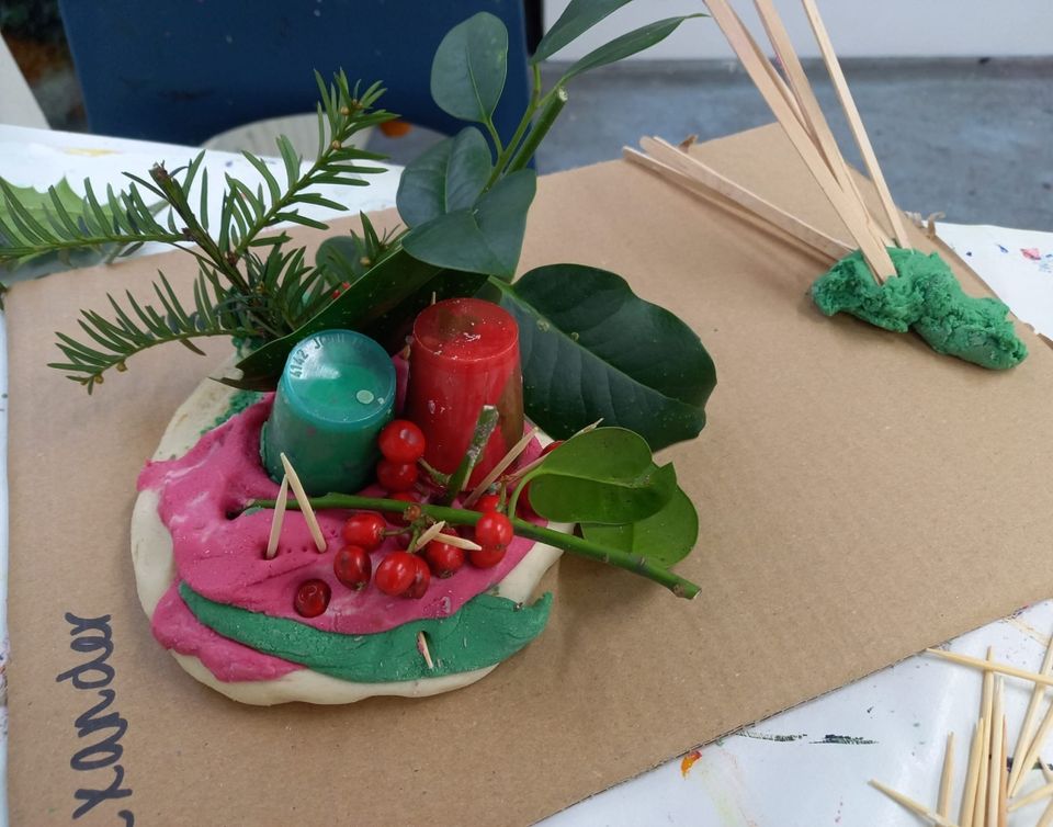 12 december: Kerststukje: met zoutbrooddeeg in verschillende kleuren en kerstversiersels een kerststukje maken.