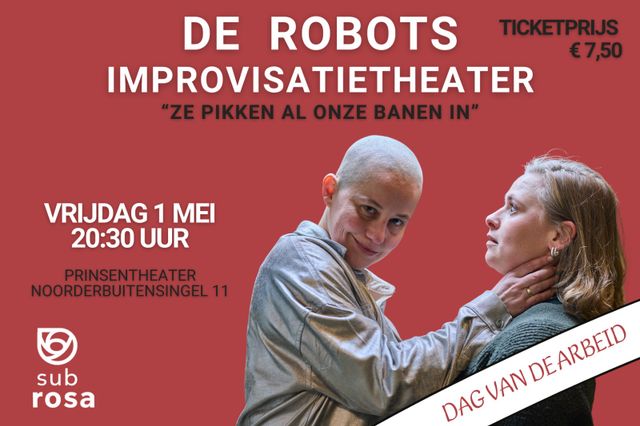 GRONINGEN — Op vrijdag 1 mei, de Dag van de Arbeid, presenteert improvisatietheater-gezelschap Sub Rosa een nieuwe theateravond: De Robots – "Ze pikken al onze banen in". De avond is bijzonder om meer dan één reden: het is de laatste voorstelling die Sub Rosa speelt in het VRIJDAG Prinsentheater aan de Noorderbuitensingel, waar het gezelschap al jarenlang zijn thuis had. In de zomer van 2026 verhuist VRIJDAG naar een nieuw gebouw aan de Sint Jansstraat, waar het verder gaat onder de naam Tumult.