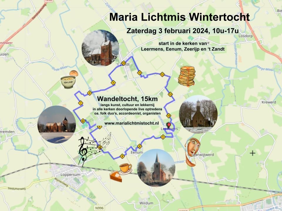 De tocht is een fraaie gelegenheid om het Groninger platteland te verkennen. De Maria-Lichtmis Winterwandeling op zaterdag 7 februari telt ongeveer 15 kilometers langs de kerken van Leermens, Eenum, Zeerijp en ’t Zandt.