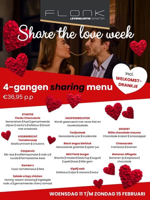 Van 11 t/m 15 februari staat alles in het teken van liefde, gezelligheid en goed eten We serveren een speciaal Valentijnsmenu Ên er komen acties voor lunch en Hapas...