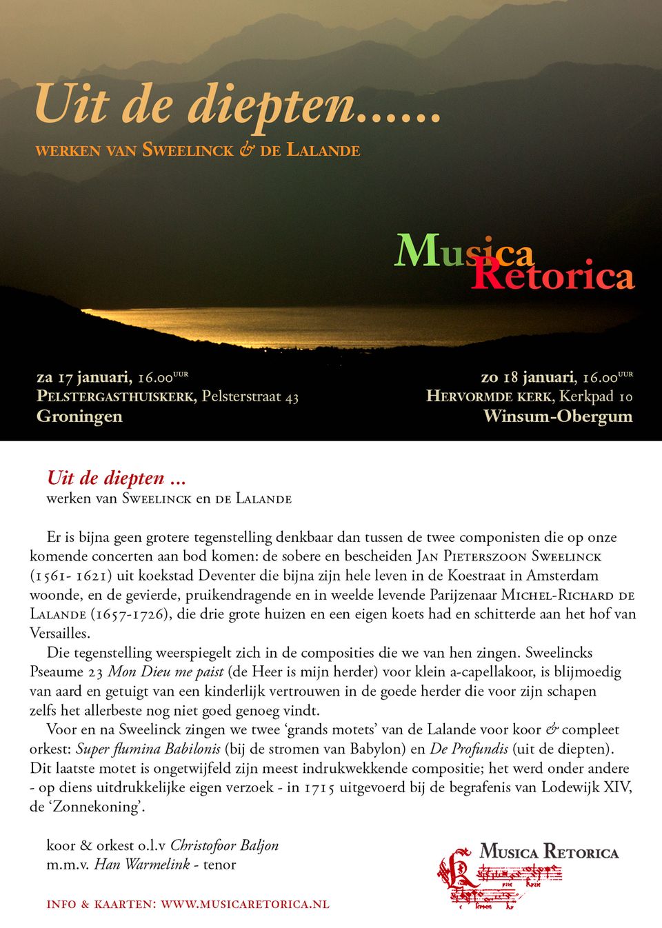 Er is bijna geen grotere tegenstelling denkbaar dan tussen de twee componisten die op onze komende concerten aan bod komen: de sobere en bescheiden Jan Pieterszoon Sweelinck (1561-1621) uit koekstad Deventer die bijna zijn hele leven in de Koestraat in Amsterdam woonde, en de gevierde, pruikendragende en in weelde levende Parijzenaar Michel-Richard De Lalande (1657-1726), die drie grote huizen en een eigen koets had en schitterde aan het hof van Versailles.
