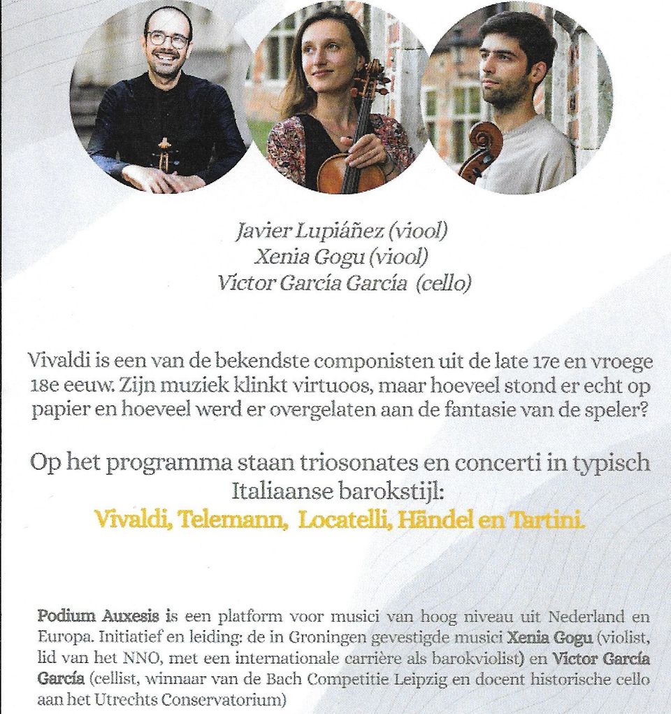 Podium AuXesis (Xenia Gogu-barokviool en Victor Garçia Garçia-barokcello) gaat een uiterst vruchtbare samenwerking aan met Javier Lupañez (barokviool). Deze heeft een database gepubliceerd over 18e eeuwse Italiaanse versieringen. Virtuozen als zij alle drie op hun instrumenten zijn, belooft het een vrolijk, uitbundig concert te worden vol vuurwerk. Op beide concertlocaties is het contact tussen spelers en publiek heel nauw, wat het helemaal past bij het improviserende karakter.