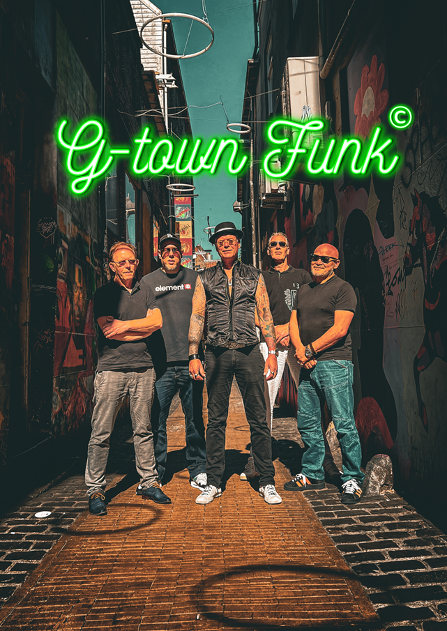 Met een strakke ritmesectie, funky gitaren, vette keys en soulvolle vocalen zorgt G-town Funk voor een muzikale show vol energie, plezier en lekkere funk vibes!