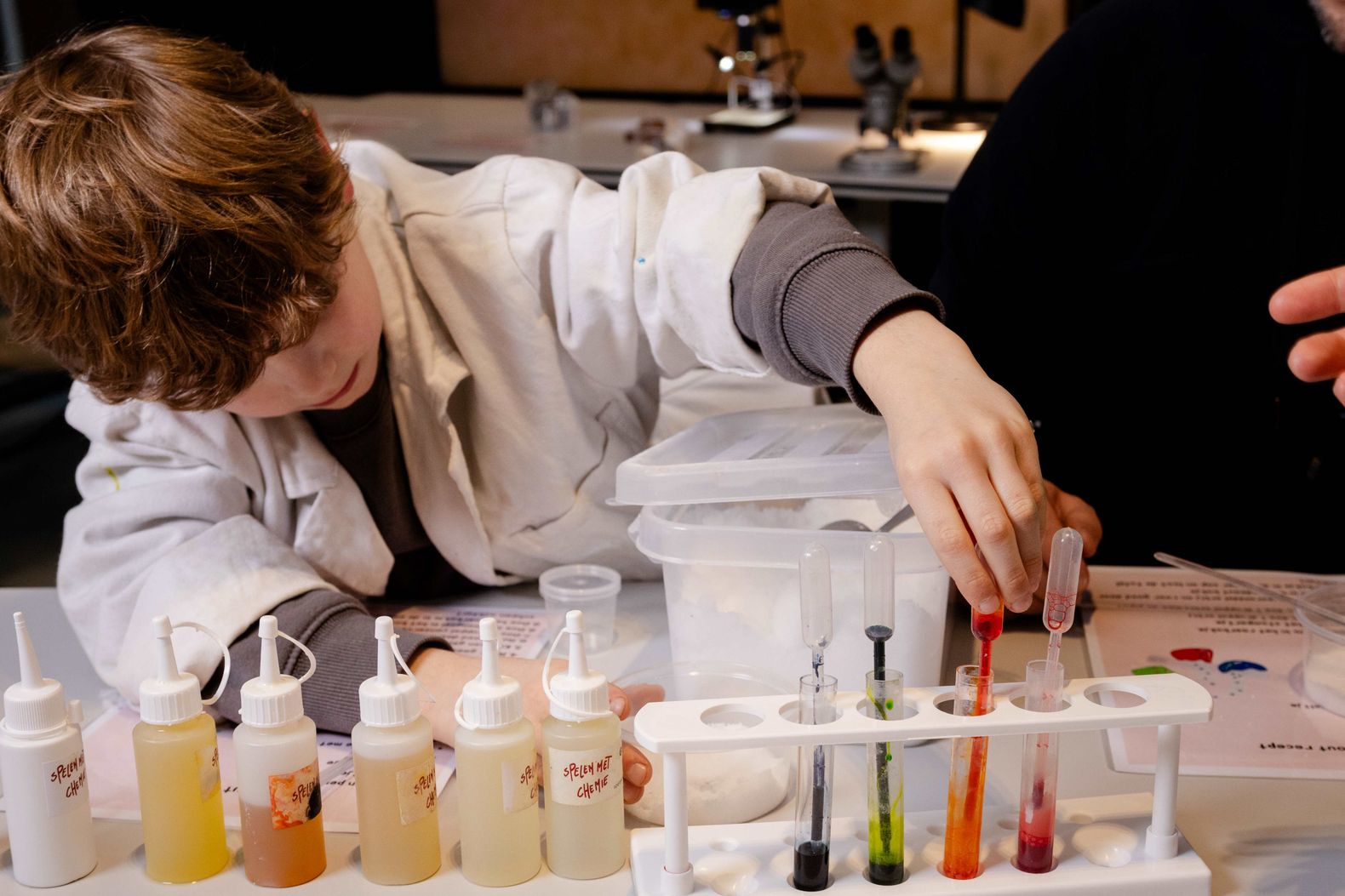 In een echte lange witte labjas maak jij je heerlijk geurende badzout, natuurlijk met een leuk kleurtje. Ben je nieuwsgierig en wil je meer weten over bijzondere wetenschappelijke verschijnselen? Dan moet je zeker even naar de experimentenhoek! Weet jij bijvoorbeeld al hoe een plasmabol of prisma werkt? In de experimentenhoek krijg je antwoord op veel vragen. Daarnaast kun je zelf een optische illusie knutselen.