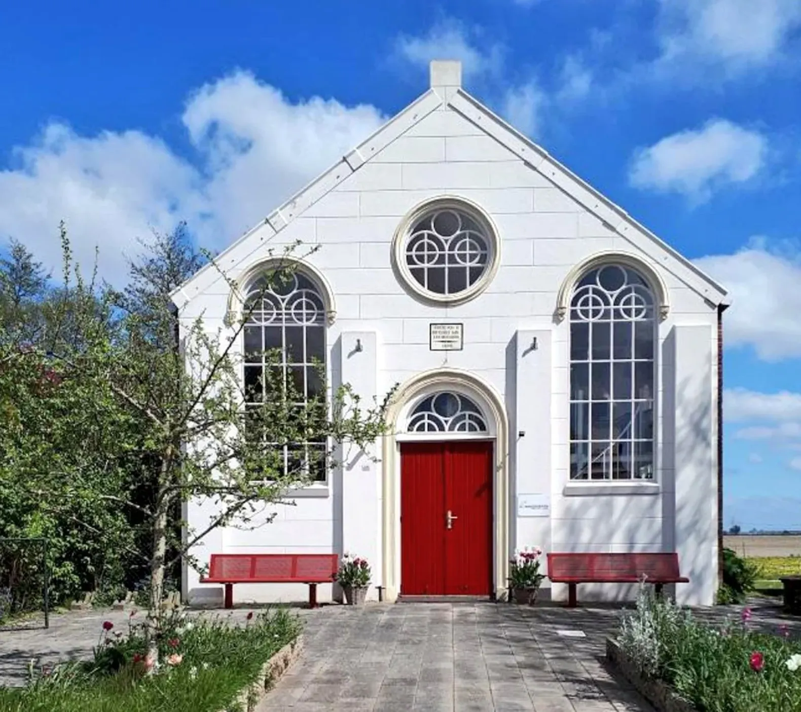 Tot vakantiewoning omgebouwd liefelijk kerkje, compleet ingericht en met een fenomenaal uitzicht over de velden.